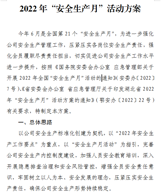 5月31日,公司研究制定了《2022年“安全生產(chǎn)月”活動(dòng)方案》,成立了“安全生產(chǎn)月”活動(dòng)領(lǐng)導(dǎo)小組,并以活動(dòng)領(lǐng)導(dǎo)小組為核心,全面部署開(kāi)展安全生產(chǎn)月專(zhuān)項(xiàng)活動(dòng),積極動(dòng)員公司全員參與,充分彰顯了領(lǐng)導(dǎo)帶頭抓安全、人人講安全的良好風(fēng)貌。
