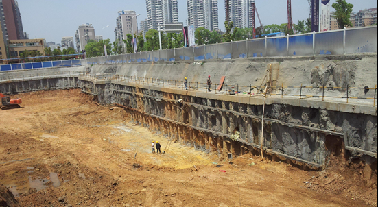 工程特點:項目位于武昌區(qū)武珞路老武鍋內,設置二層滿鋪地下室,開挖深度9.70m~15.50m,周長380m,面積8500m2。